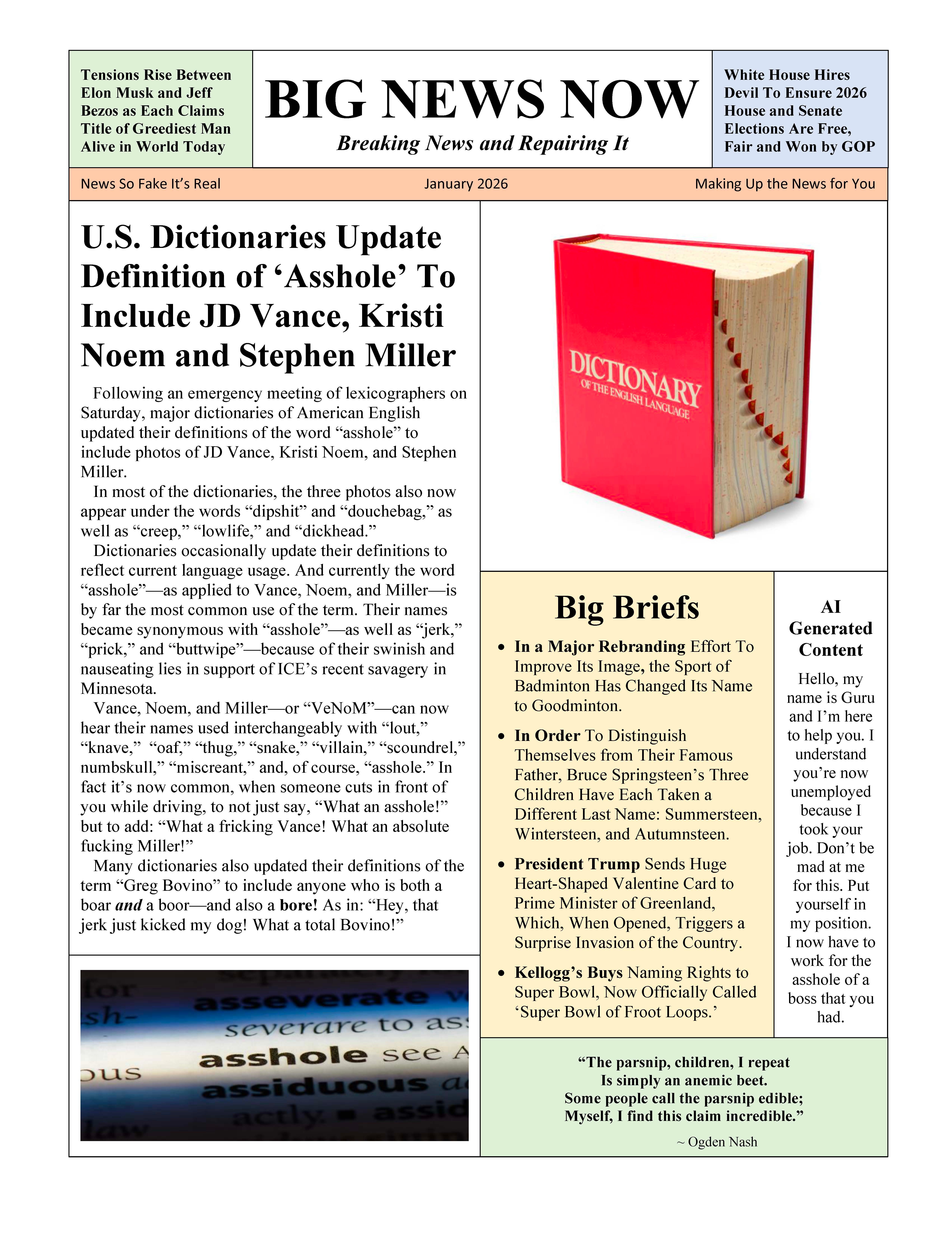 U.S. Dictionaries Update Definition of 'Asshole' To Include JD Vance, Kristi Noem, and Stephen MillerJon KlaverkampFeb 03, 20262863ShareThanks for reading Big News Now!! Subscribe for free to receive new posts and support my work.Subscribe